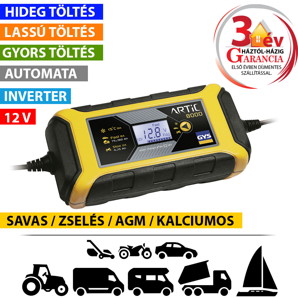 Az ARTIC 8000 akkumulátor töltő a legtöbb karbantartást igénylő vagy karbantartásmentes, ólomakkumulátor töltésére lett kifejezetten kifejlesztve, melyet autóknál és sok egyéb járműnél használnak. Ezek az akkumulátorok különböző típusúak lehetnek, pl.: ZSELÉS (zselésített elektrolitú), AGM (felitatott elektrolitú), savas, karbantartásmentes, kalciumos...