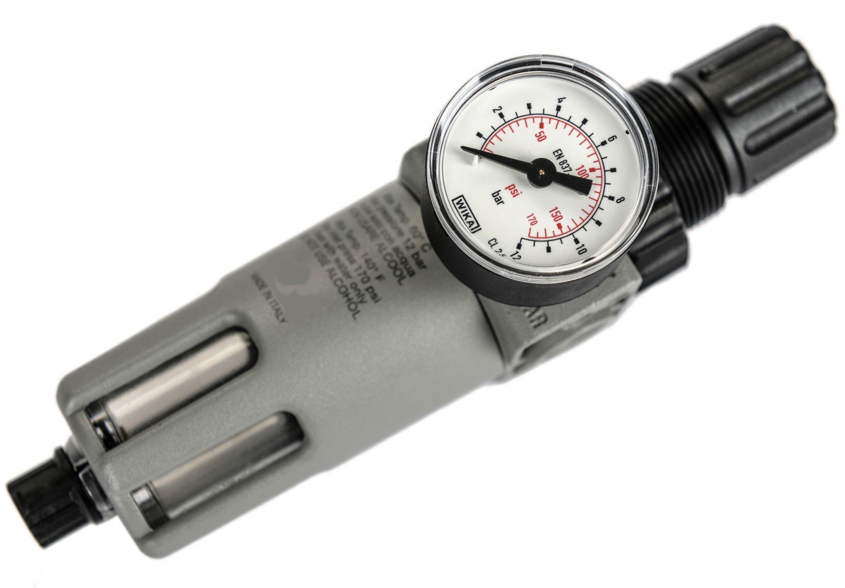 A sűrített levegős hálózatba építhető 1/4" szűrő-szabályzó, vízleválasztó egység centrifugál elvű szinterszűrővel van ellátva. A vízleeresztés kézi működtetésű.