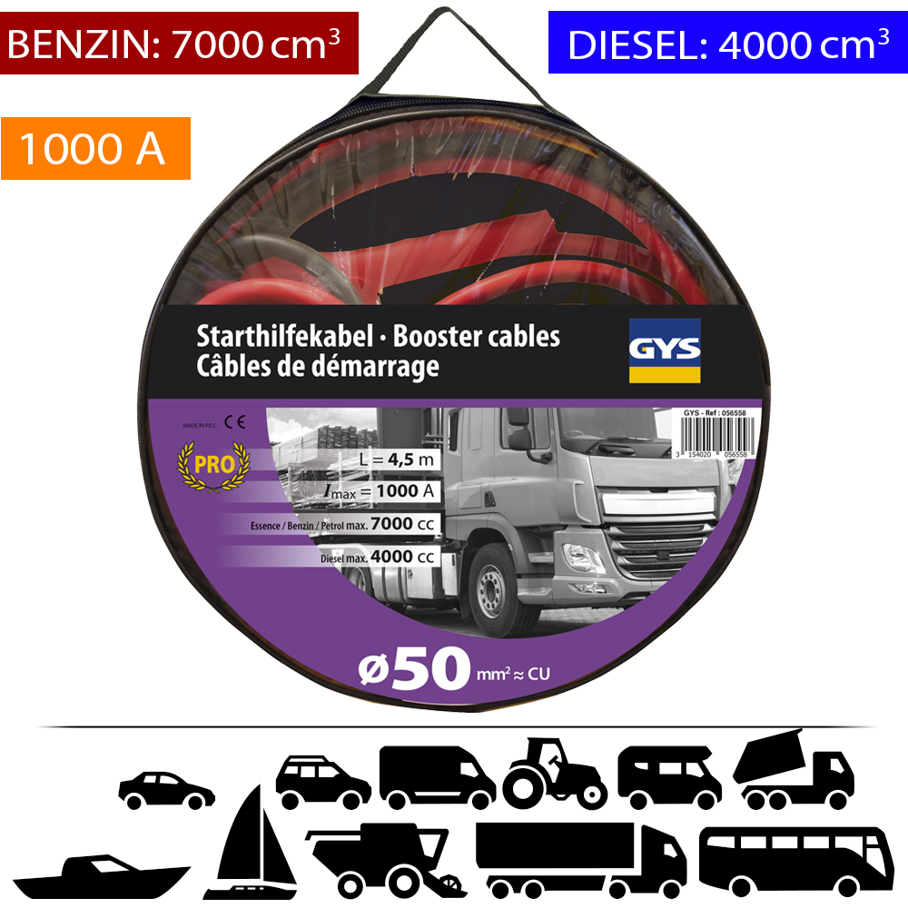 A GYS hosszú és ellenálló indítókábelt hordtáskával szállítjuk, így könnyen szállítható és praktikusan tárolható.